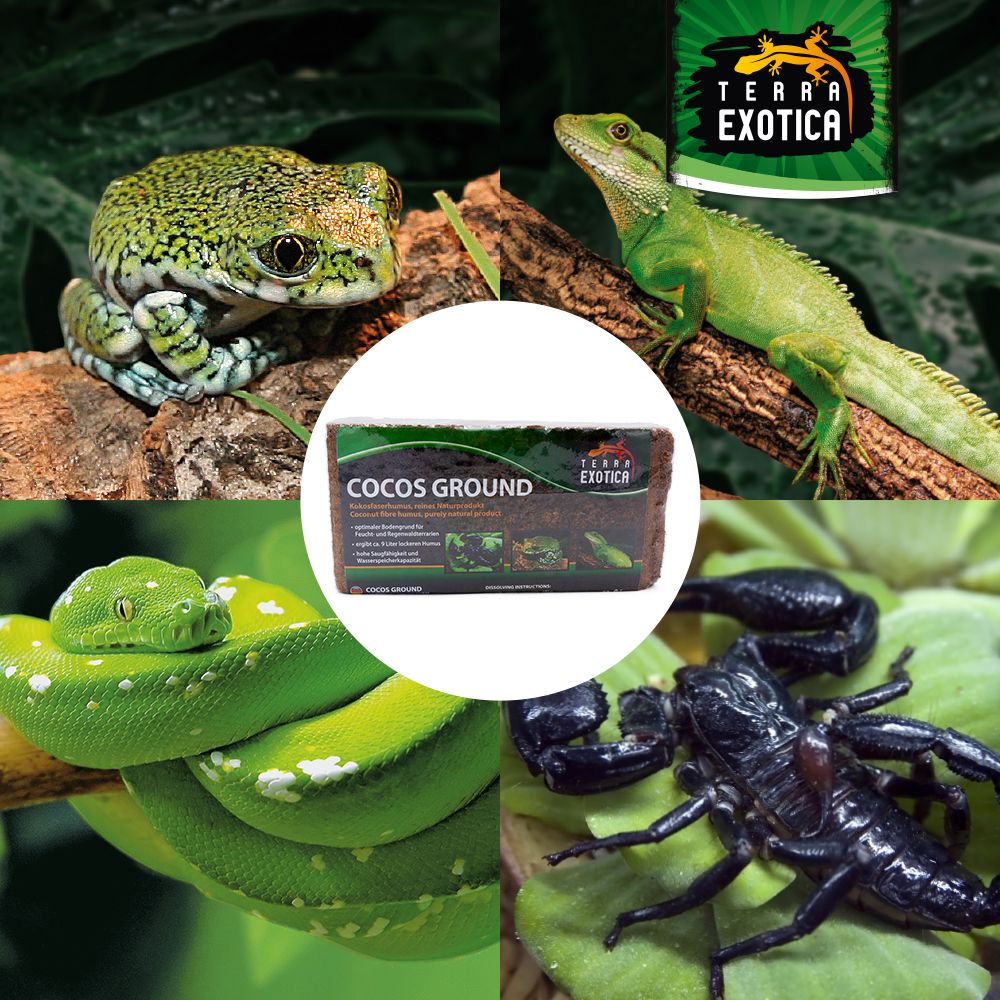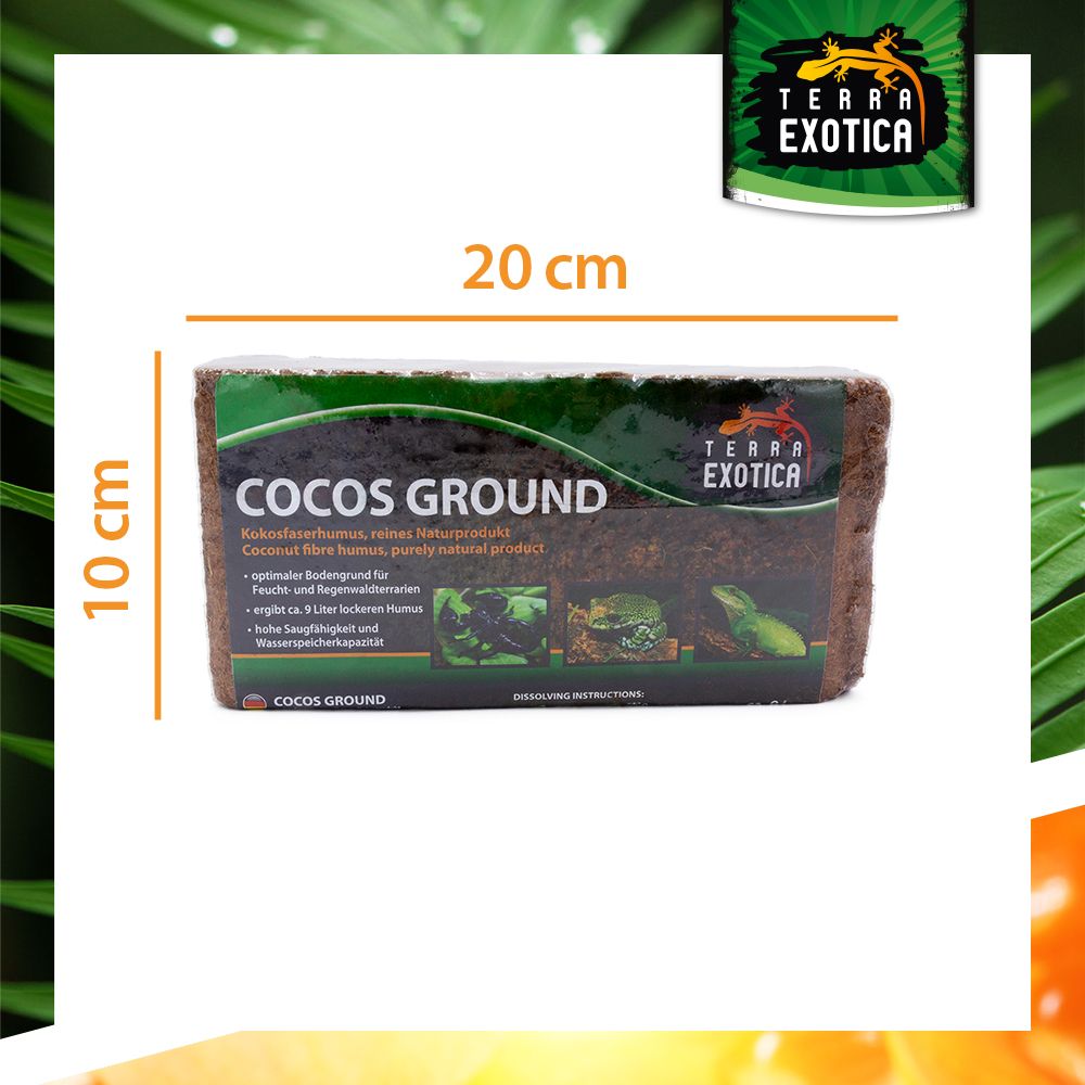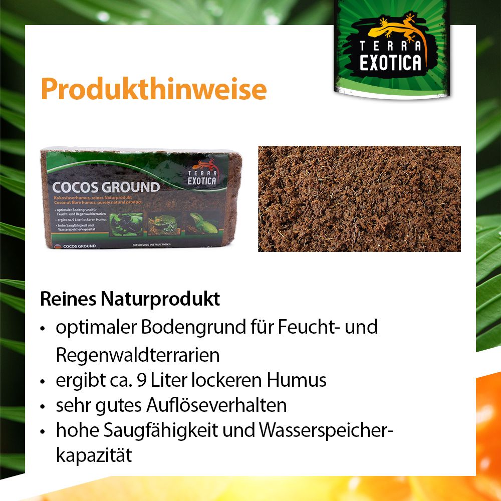 Der Terra Exotica Cocos Ground – Fein ist ein 100 % natürliches Substrat aus gepressten Kokosfasern und bildet den idealen Bodengrund für Feucht- und Regenwaldterrarien. Mit Wasser aufgequollen ergibt der Block ca. 9 Liter lockeren Humus, der sich hervorragend für Amphibien, Reptilien und Wirbellose eignet, die einen feuchten Lebensraum bevorzugen.