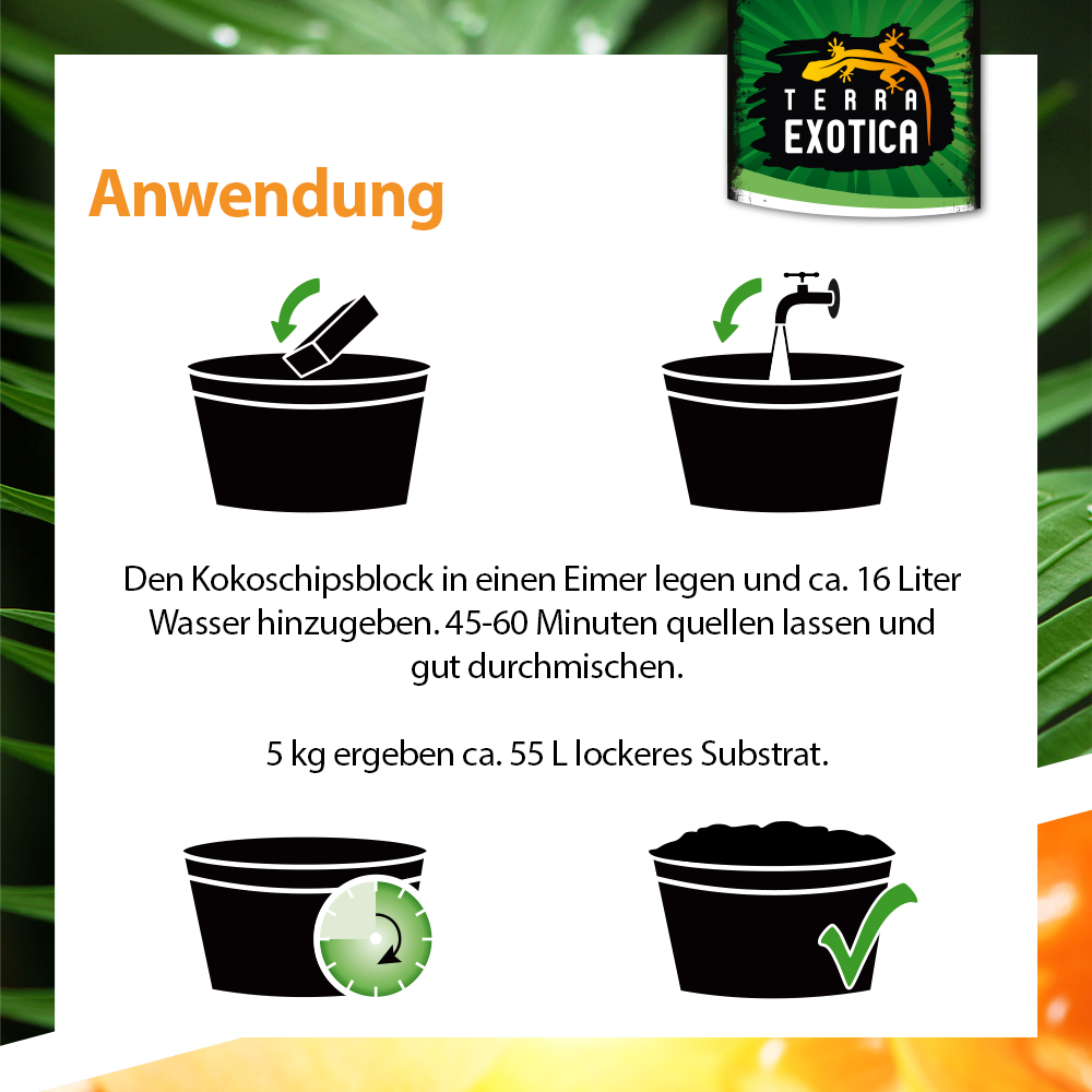 Mit Wasser aufgequollen ergibt der Block ca. 55 Liter lockeres Substrat, das durch seine hohe Saugfähigkeit und Wasserspeicherkapazität für ein optimales Terrarienklima sorgt. Der grobe Aufbau des Substrats fördert zudem die Luftzirkulation im Bodengrund, verhindert Staunässe und bietet Pflanzen ideale Wachstumsbedingungen.
