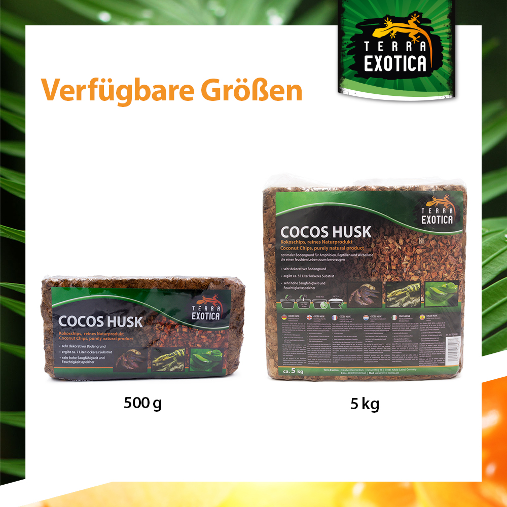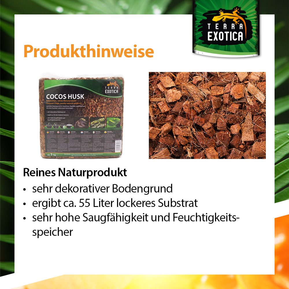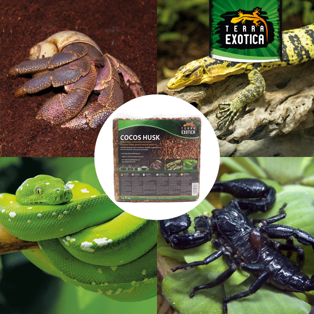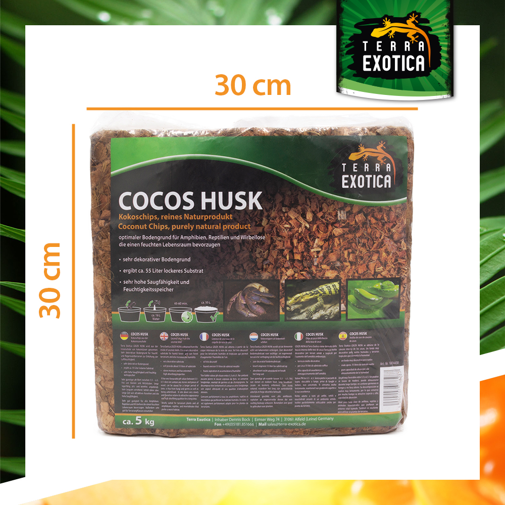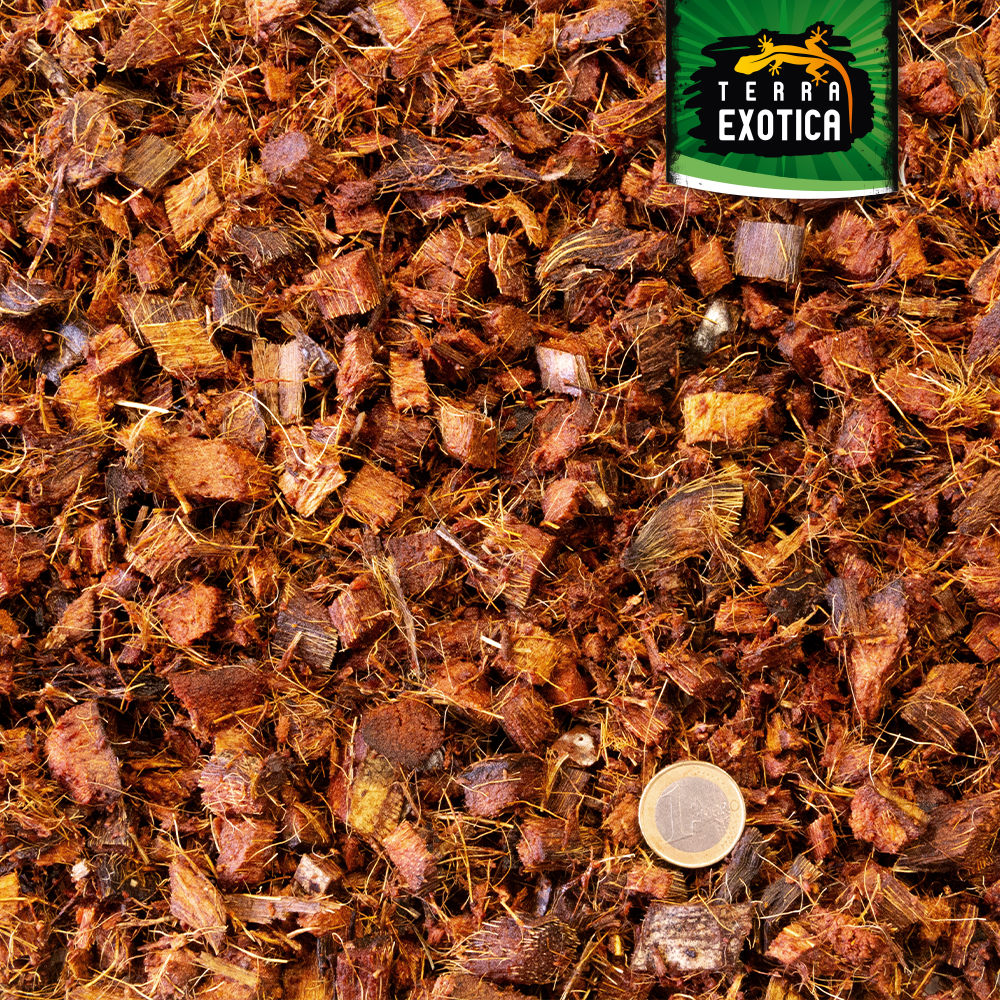 Der Terra Exotica Cocos Husk – Grob ist ein natürlicher, dekorativer Bodengrund für Feucht- und Regenwaldterrarien. Das Substrat wird aus der Innenschale von Kokosnüssen gewonnen und ist somit ein 100 % reines Naturprodukt. Es eignet sich ideal für Amphibien, Reptilien und Wirbellose, die ein feuchtwarmes Klima bevorzugen.