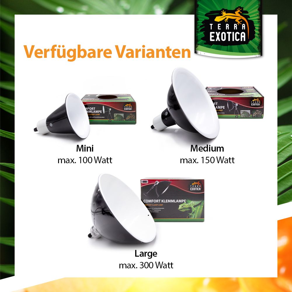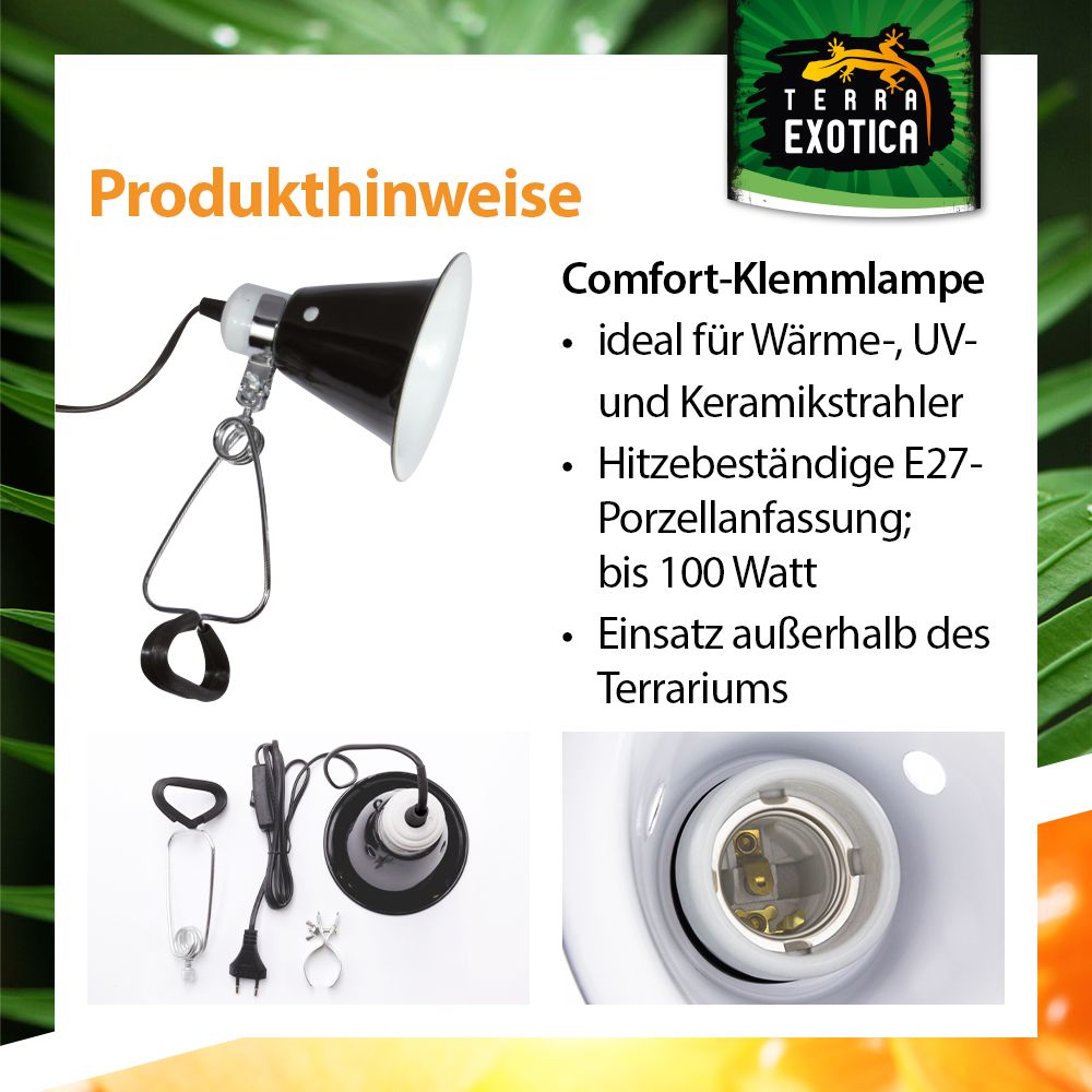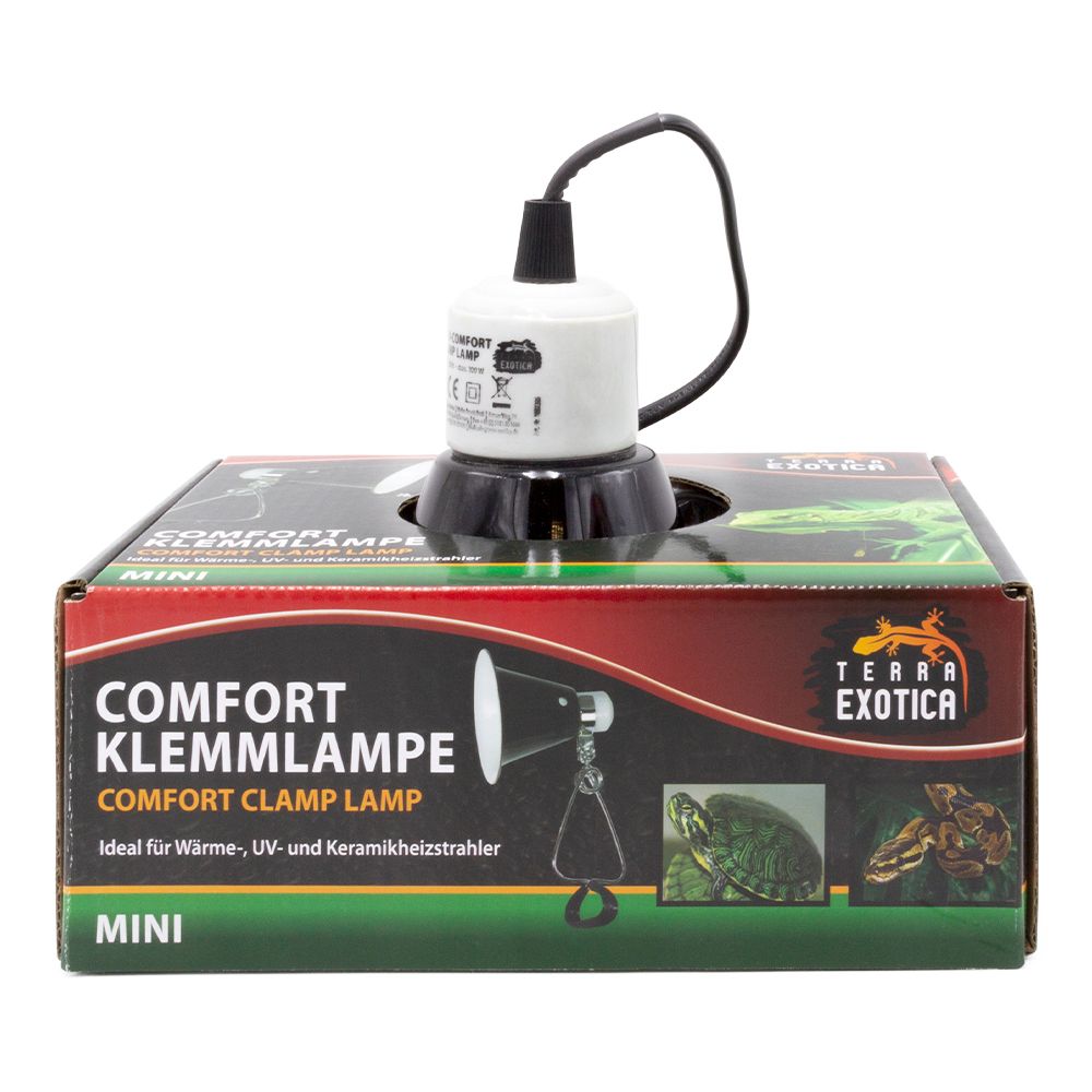 Die Comfort Clamp Lamp – Mini (14 × 16 cm) ist die kompakte Version der bewährten Comfort-Klemmlampen-Serie. Mit ihrer hitzebeständigen E27-Porzellanfassung eignet sie sich ideal für den Betrieb von Wärme-, UV- und Keramikheizstrahlern bis 100 Watt. Perfekt für den Einsatz außerhalb des Terrariums und überall dort, wo platzsparende und sichere Beleuchtung gefragt ist.