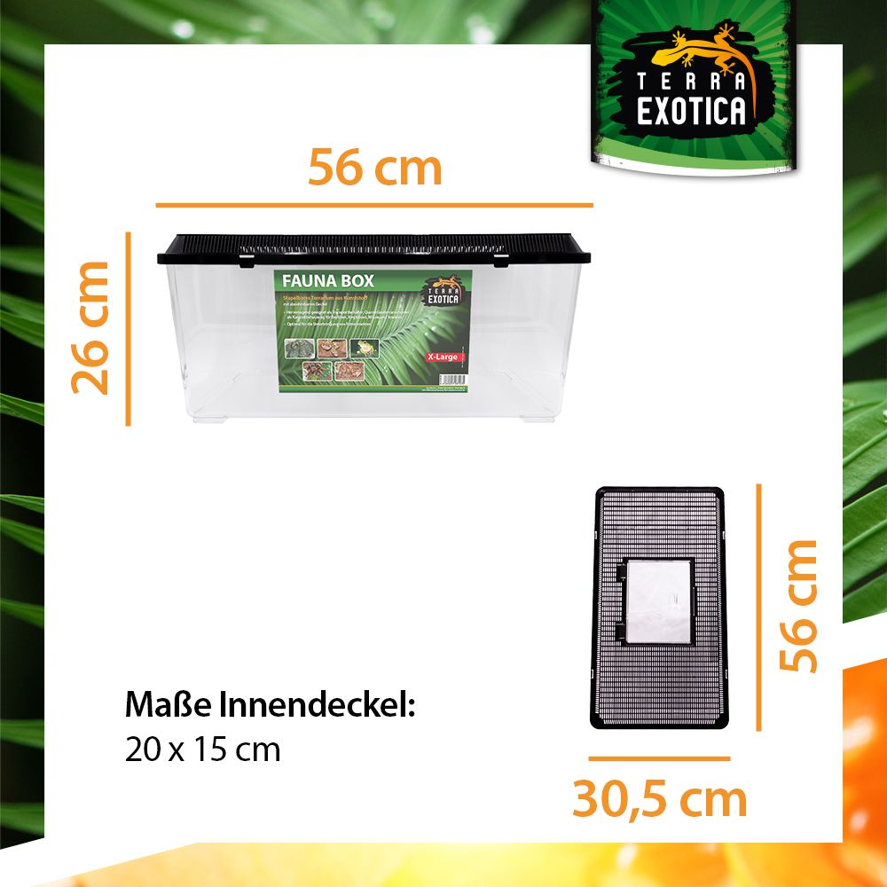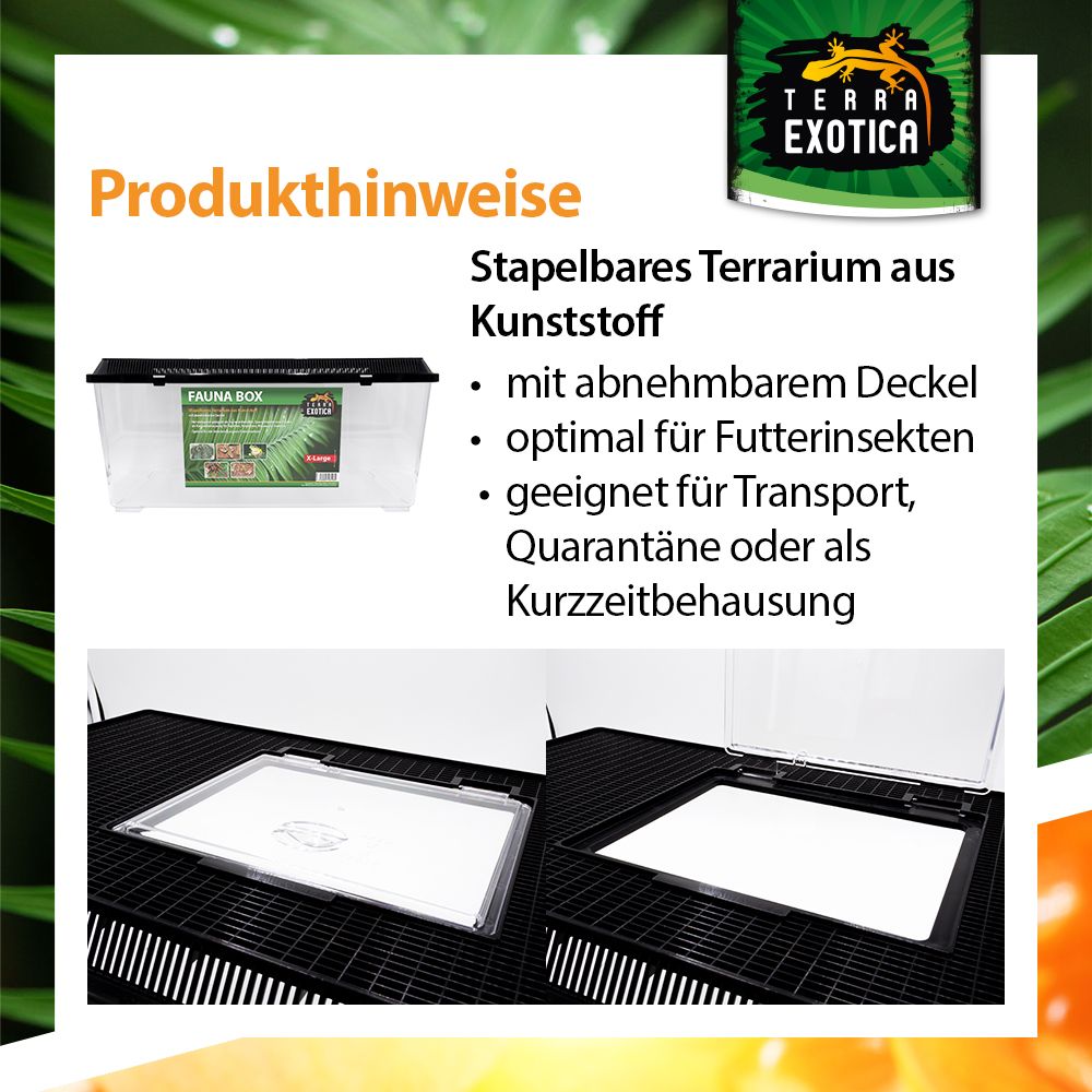 Die Fauna Box Extra-Large (56 × 30,5 × 26 cm) ist ein vielseitiges, stapelbares Kunststoff-Terrarium, das optimale Bedingungen für die Haltung, Zucht und den Transport verschiedenster Tierarten bietet. Sie überzeugt durch Stabilität, Funktionalität und einfache Handhabung – ideal für den privaten und professionellen Einsatz in der Terraristik.
