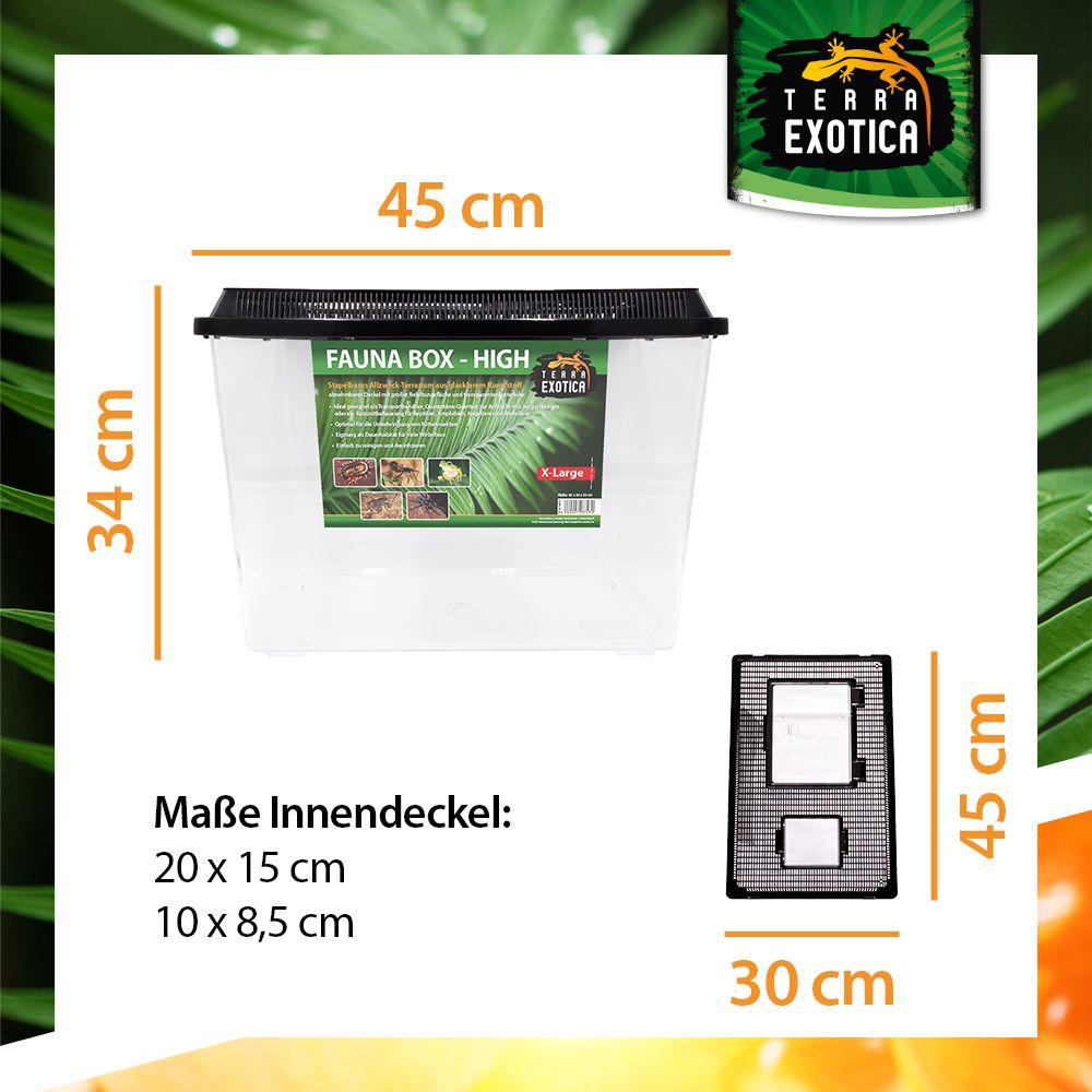 Die Fauna Box High Extra-Large (45 × 30 × 34 cm) ist ein vielseitiges, stapelbares Kunststoff-Terrarium, das optimale Bedingungen für die Haltung, Zucht und den Transport verschiedenster Tierarten bietet. Sie überzeugt durch Stabilität, Funktionalität und einfache Handhabung – ideal für den privaten und professionellen Einsatz in der Terraristik.
