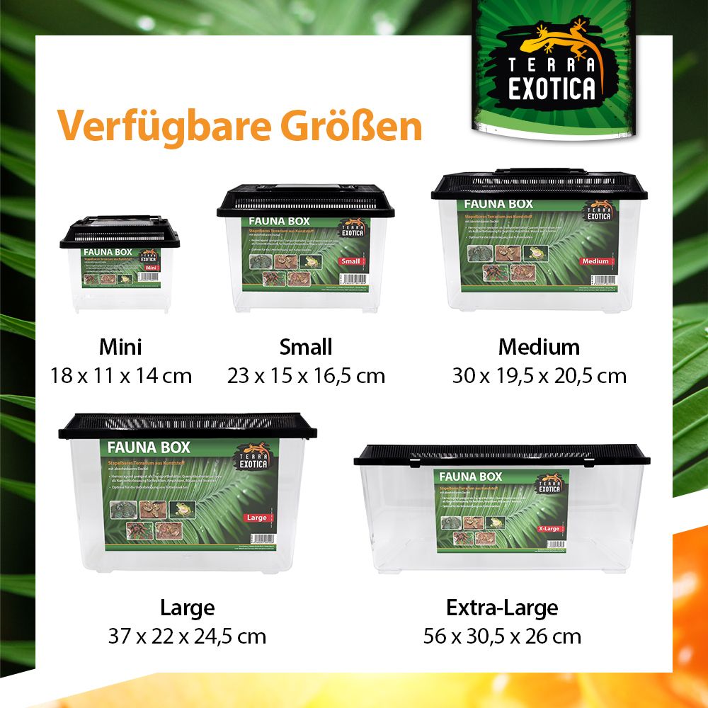 Die Fauna Box Large (37 × 22 × 24,5 cm) ist ein vielseitiges, stapelbares Kunststoff-Terrarium, das optimale Bedingungen für die Haltung, Zucht und den Transport verschiedenster Tierarten bietet. Sie überzeugt durch Stabilität, Funktionalität und einfache Handhabung – ideal für den privaten und professionellen Einsatz in der Terraristik.