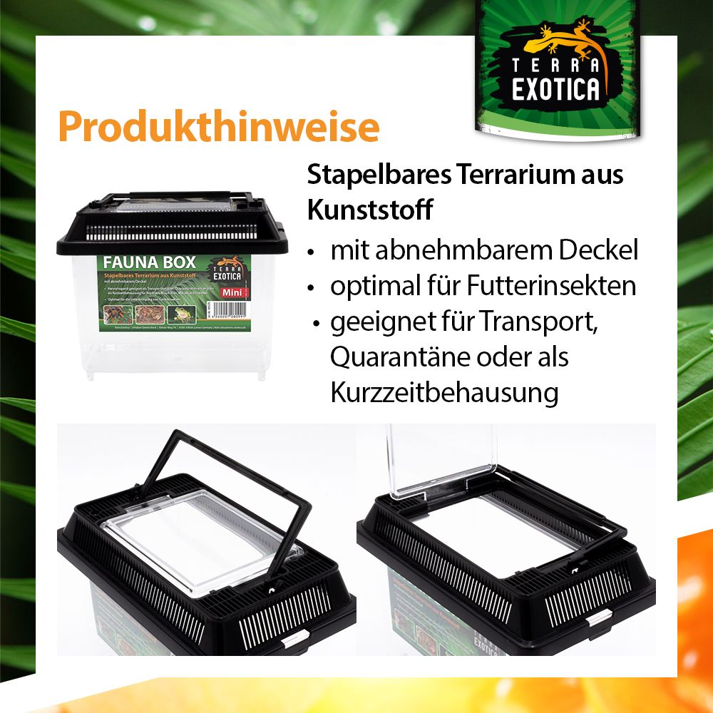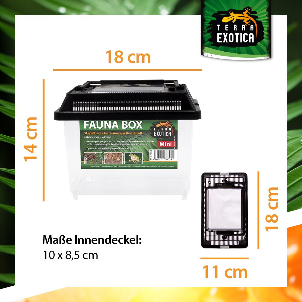 Die Fauna Box Mini (18 × 11 × 14 cm) ist ein vielseitiges, stapelbares Kunststoff-Terrarium, das optimale Bedingungen für die Haltung, Zucht und den Transport verschiedenster Tierarten bietet. Sie überzeugt durch Stabilität, Funktionalität und einfache Handhabung – ideal für den privaten und professionellen Einsatz in der Terraristik.