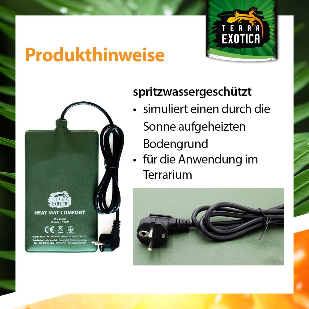 Die Comfort Heizmatte ist eine zuverlässige und energiesparende Grundheizung für Terrarien, die den durch die Sonne aufgeheizten Bodengrund natürlich simuliert. Sie sorgt für eine gleichmäßige Wärmeverteilung und erzeugt langwellige Infrarotstrahlung, die besonders sanft und effektiv wirkt – ideal für die meisten Terrarientiere sowie zur Pflanzenzucht.
