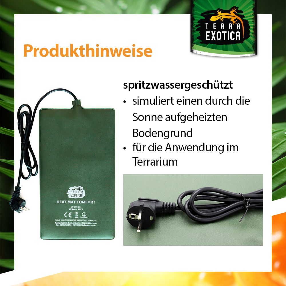 Die Comfort Heizmatte ist eine zuverlässige und energiesparende Grundheizung für Terrarien, die den durch die Sonne aufgeheizten Bodengrund natürlich simuliert. Sie sorgt für eine gleichmäßige Wärmeverteilung und erzeugt langwellige Infrarotstrahlung, die besonders sanft und effektiv wirkt – ideal für die meisten Terrarientiere sowie zur Pflanzenzucht.