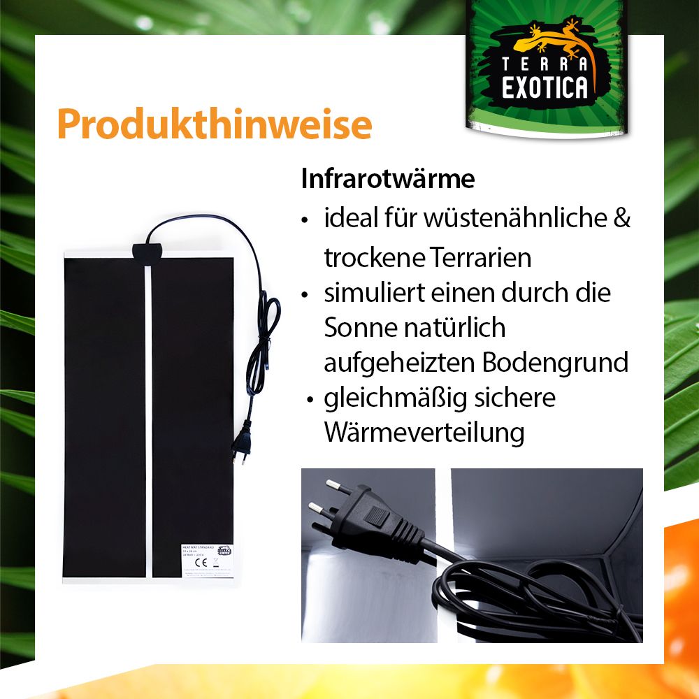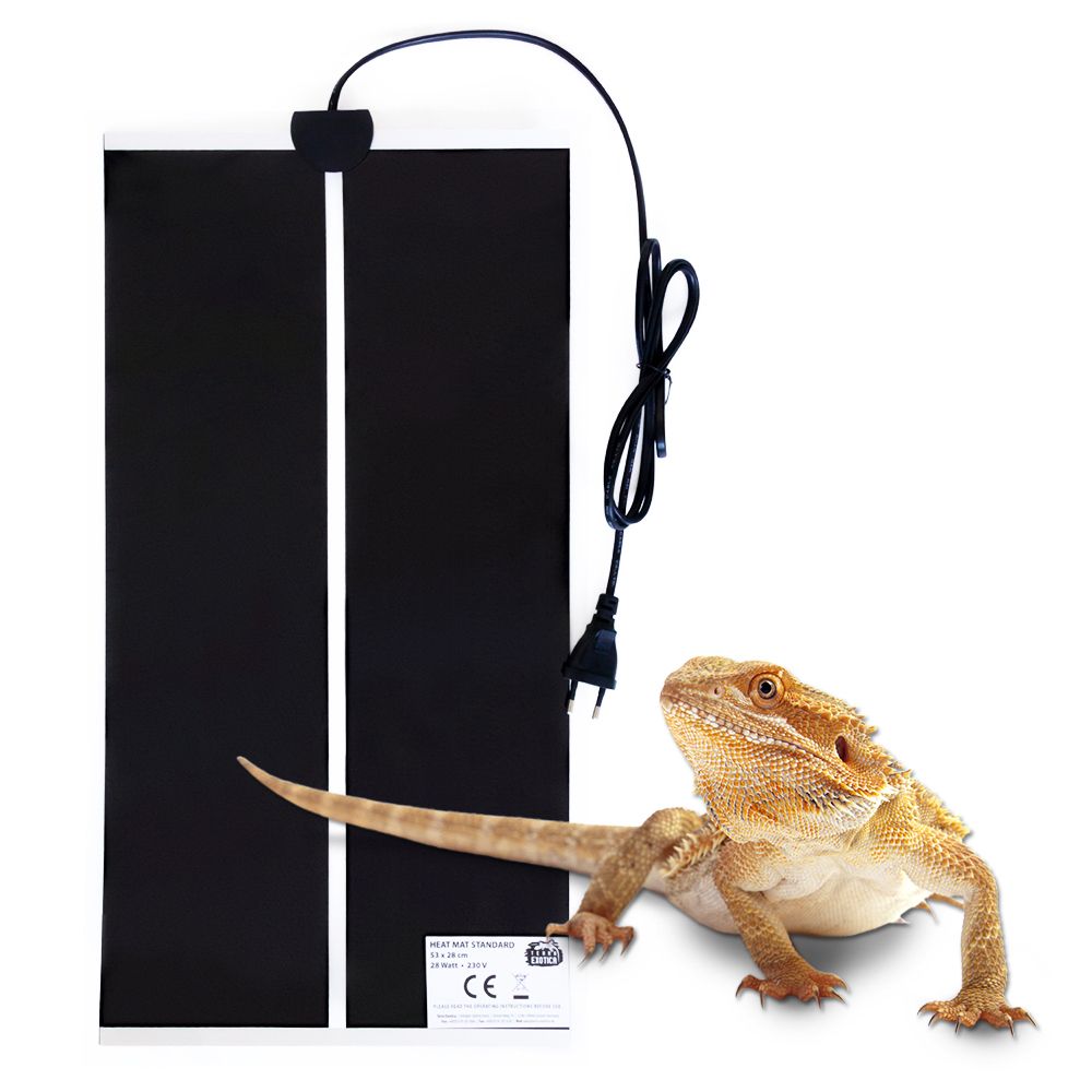 Die Standard Heizmatte bietet eine zuverlässige und konstante Grundheizung für Terrarien. Sie simuliert den durch die Sonne erwärmten Bodengrund und sorgt für eine angenehme, gleichmäßige Wärme – ideal für Reptilien, Amphibien und andere Terrarientiere. Durch ihre trockene Oberfläche erhöht sie die Luftfeuchtigkeit nicht und ist somit besonders für trockene Lebensräume geeignet.
