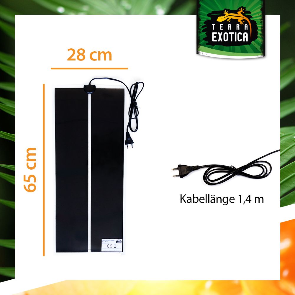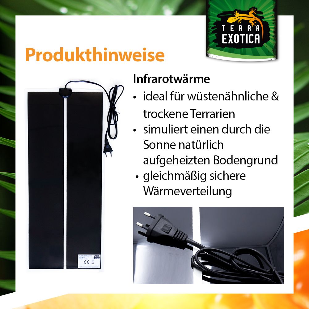 Die Standard Heizmatte bietet eine zuverlässige und konstante Grundheizung für Terrarien. Sie simuliert den durch die Sonne erwärmten Bodengrund und sorgt für eine angenehme, gleichmäßige Wärme – ideal für Reptilien, Amphibien und andere Terrarientiere. Durch ihre trockene Oberfläche erhöht sie die Luftfeuchtigkeit nicht und ist somit besonders für trockene Lebensräume geeignet.