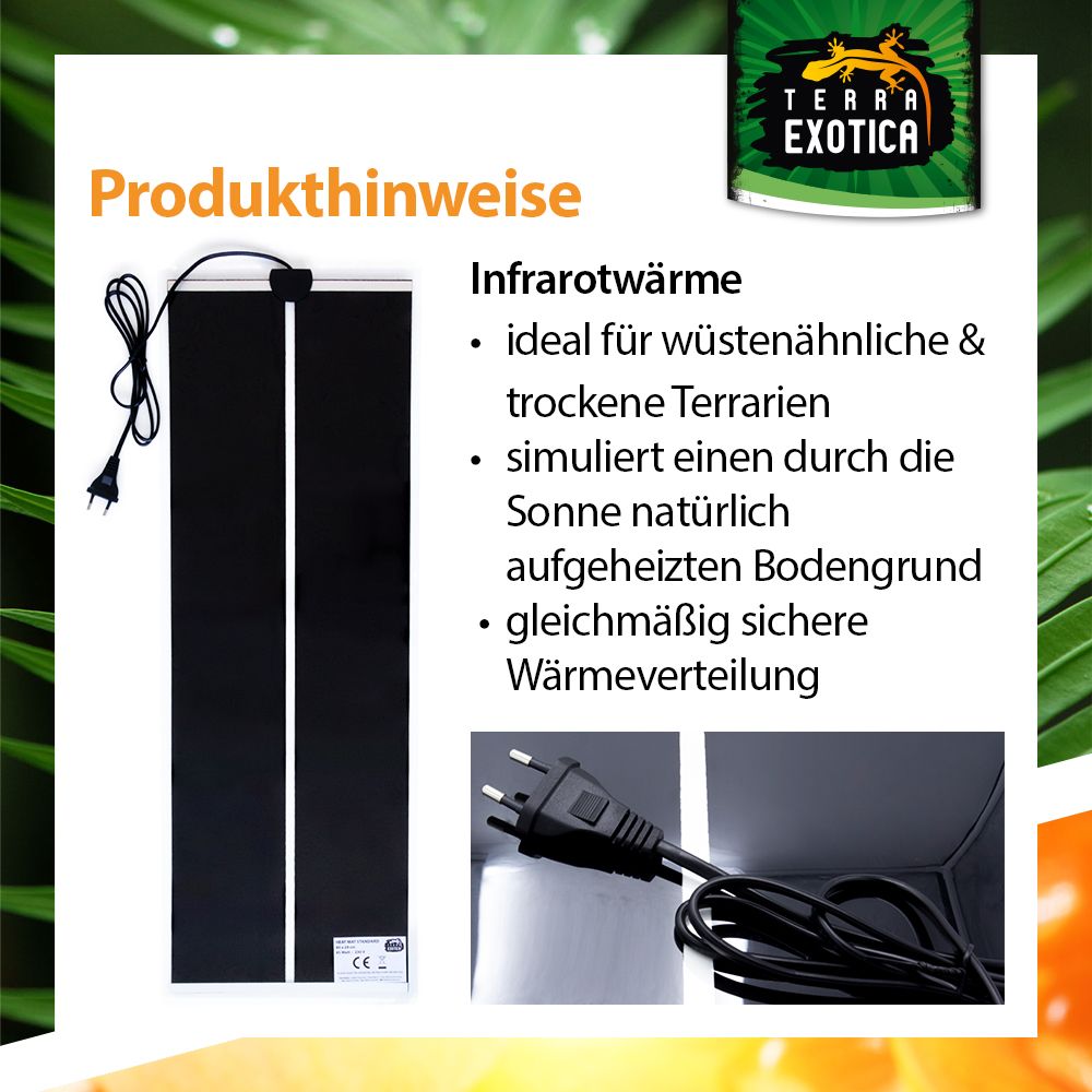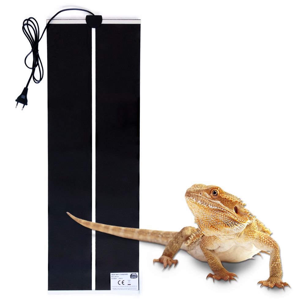 Die Standard Heizmatte bietet eine zuverlässige und konstante Grundheizung für Terrarien. Sie simuliert den durch die Sonne erwärmten Bodengrund und sorgt für eine angenehme, gleichmäßige Wärme – ideal für Reptilien, Amphibien und andere Terrarientiere. Durch ihre trockene Oberfläche erhöht sie die Luftfeuchtigkeit nicht und ist somit besonders für trockene Lebensräume geeignet.