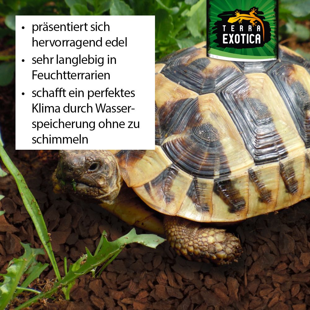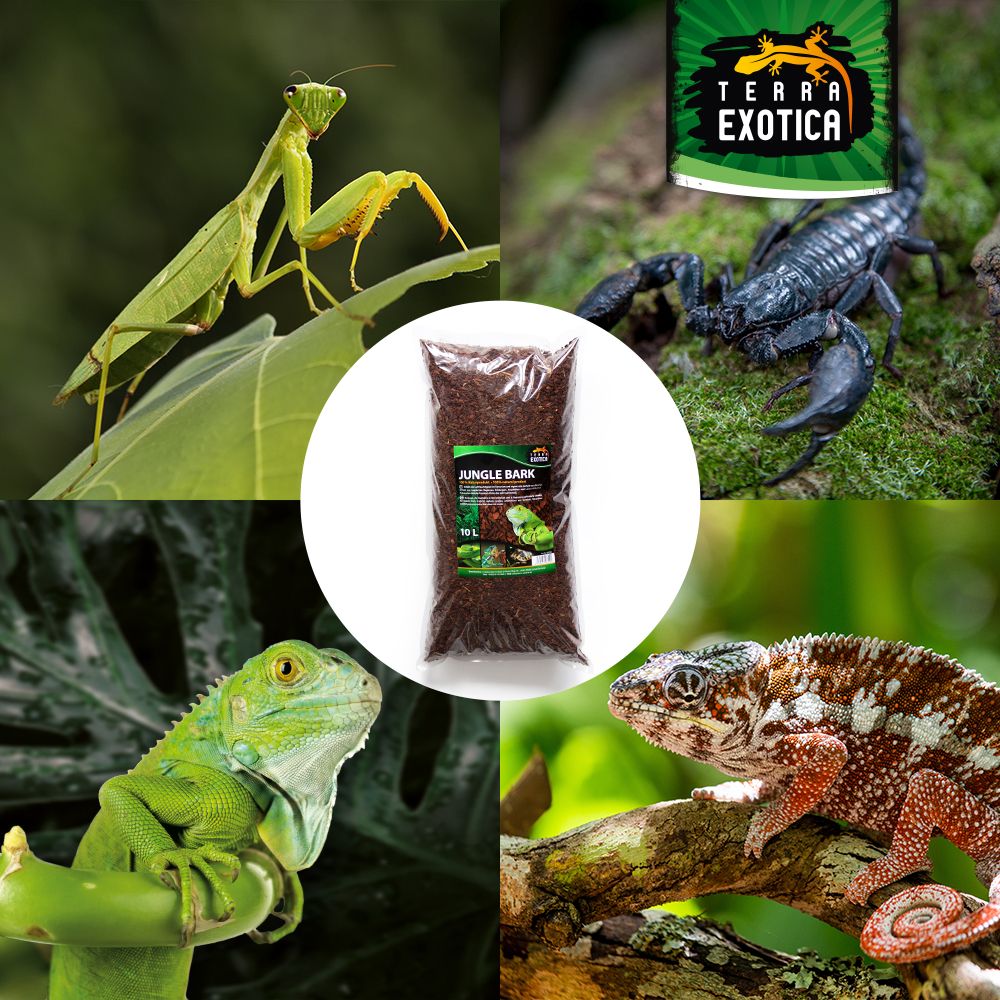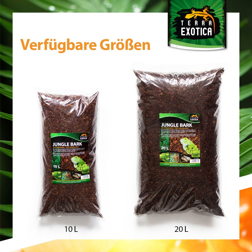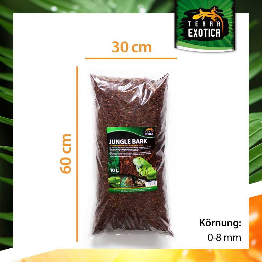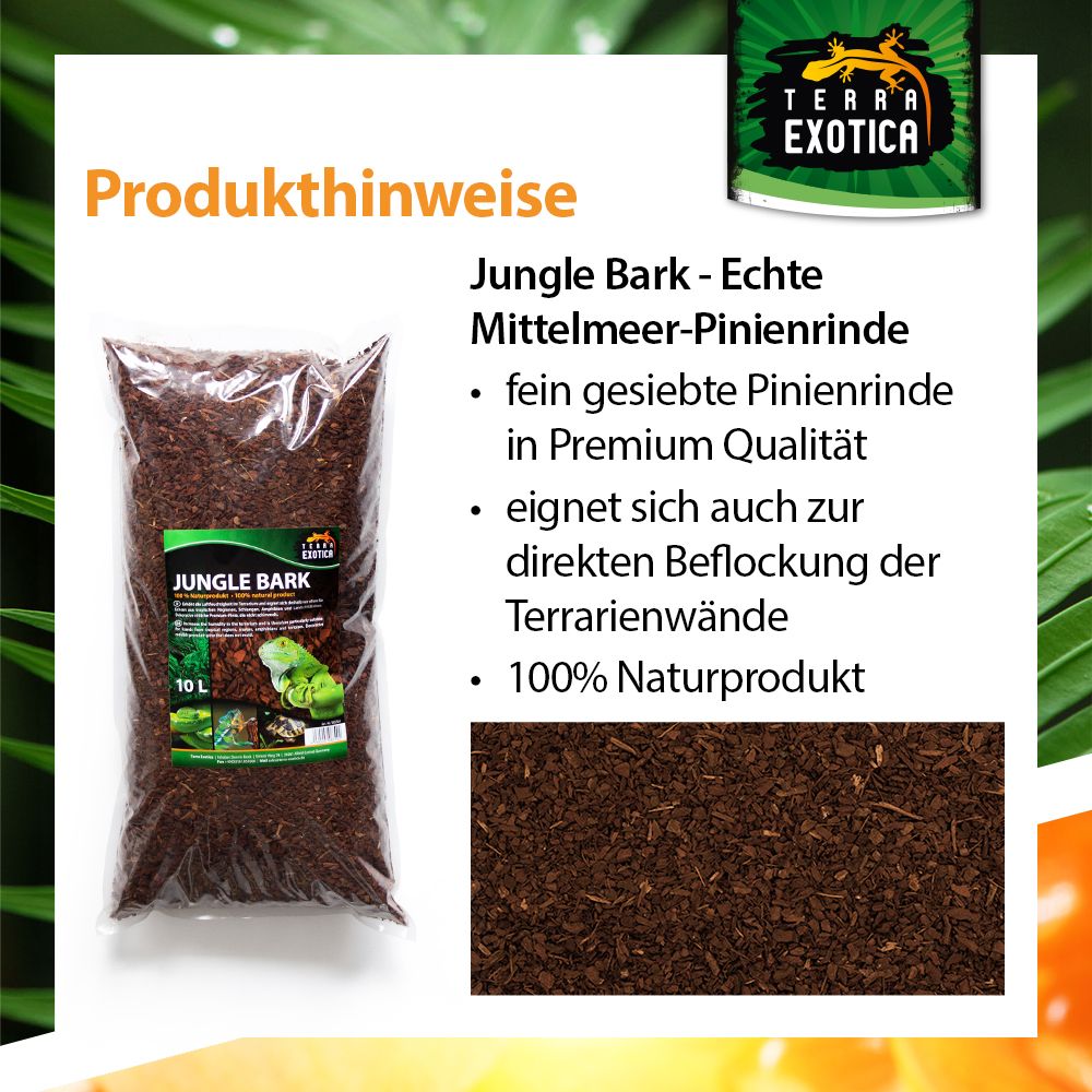Die Terra Exotica Jungle Bark ist eine fein gesiebte Pinienrinde in Premium-Qualität, gewonnen aus dekorativer rötlicher Mittelmeer-Pinie. Dieses 100 % natürliche Substrat ist der ideale Bodengrund für feuchtigkeitsliebende Reptilien und sorgt durch seine hervorragende Wasserspeicherung für ein optimales Klima im Terrarium.