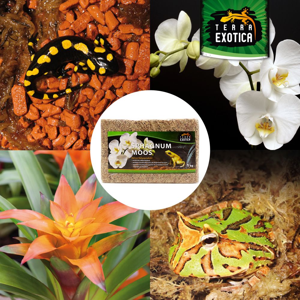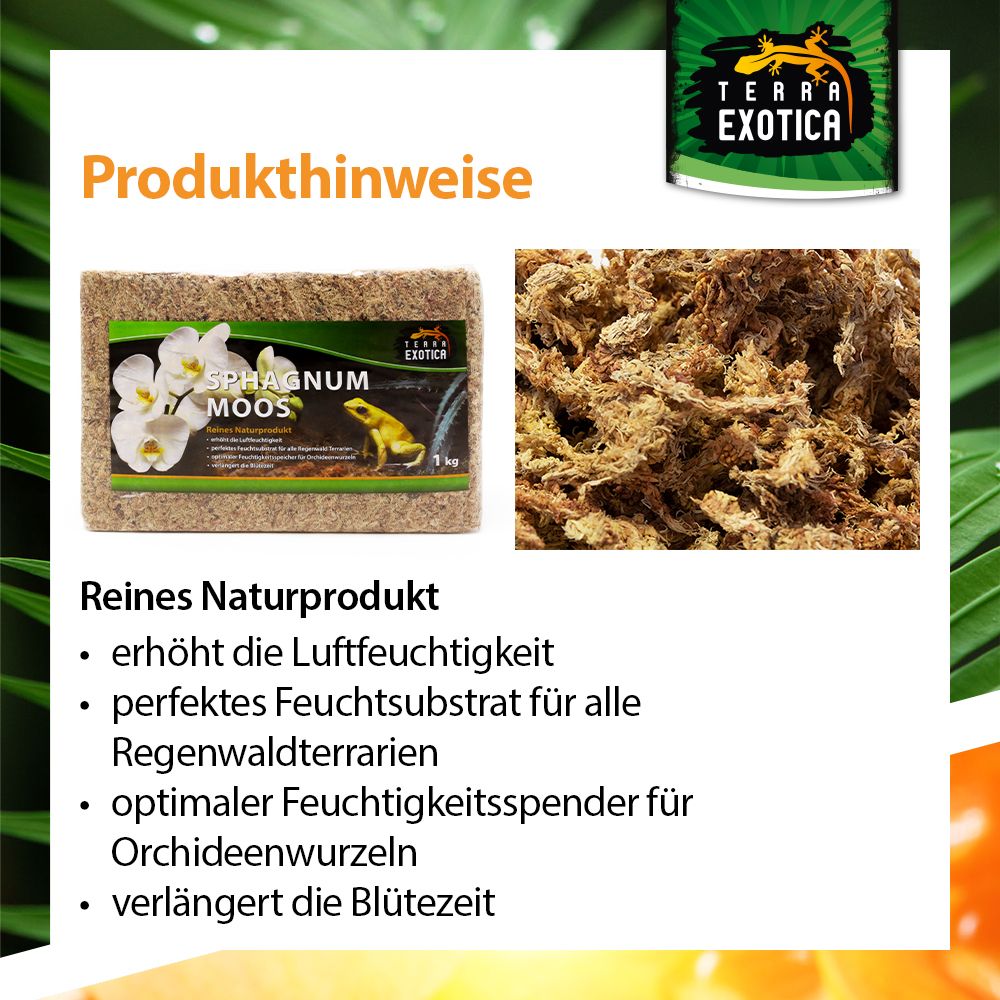 Das Moos erhöht die Luftfeuchtigkeit im Terrarium, dient als Feuchtigkeitsspender für Pflanzenwurzeln (z. B. Orchideen) und verlängert die Blütezeit. Dank seiner antibakteriellen und antibiotischen Eigenschaften ist es hygienisch, frei von Düngemitteln und Pestiziden, und eignet sich zudem als Eiablagesubstrat für Reptilien oder zur Überwinterung von Terrarientieren.